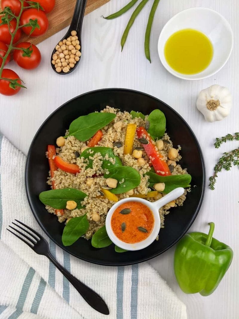 Salade de quinoa, épinards, mélange de poivrons et pois chiche, accompagnée d'une sauce tahini.